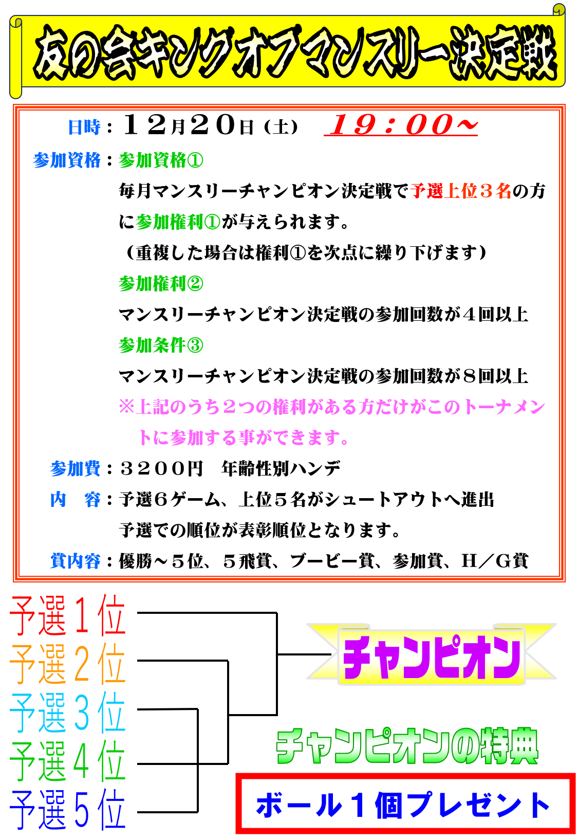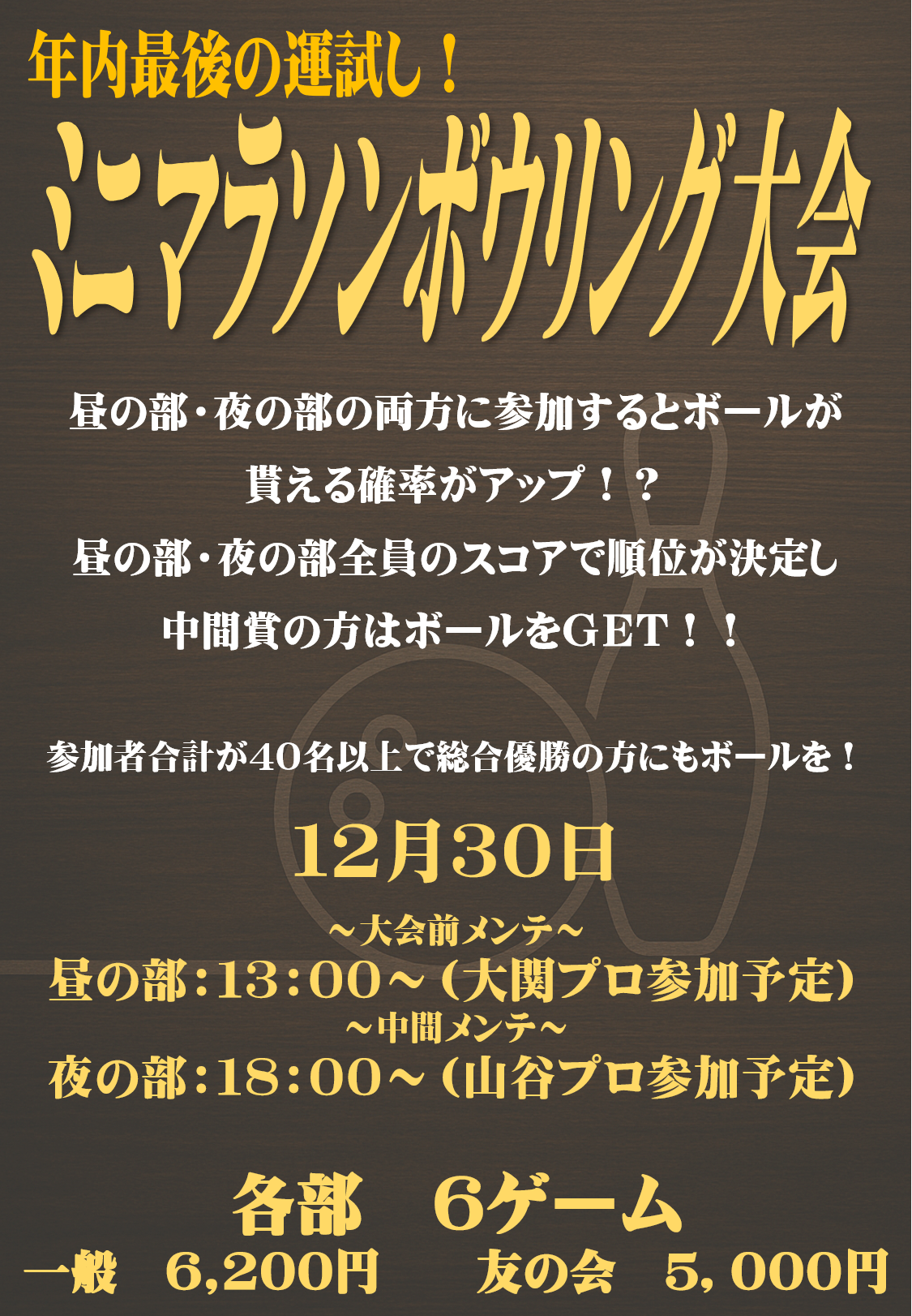 2025年11月24日 2025年11月27日 12月のセンターニュースをアップしました。 3日(水) 20:00~ 河上未希プロとボウリング14日(日) 19:00~ 小堀係員とボウリング20日(土) 19:00~ キングオブマンスリー決定戦21日(日) 9:30~ 大関隆之プロとボウリング21日(日) 19:00~ 山谷新也プロとボウリング26日(金) 10:30~ 小平房男プロとボウリング27日(土) 19:00~ 浅田梨奈プロ10周年記念大会28日(日) 19:00~ 藤井信人プロチャレンジマッチ29日(月) 14:00~ リーグ対抗戦29日(月) 20:00~ 櫻井眞利子プロ中島美穂プロとボウリング30日(日) 13:00~ 昼の部!大関プロとミニマラソンボウリング 18:00~ 夜の部!山谷プロとミニマラソンボウリング31日(水) 14:00~ 山谷新也プロと投げ納めトーナメントセンターニュースはこちらから