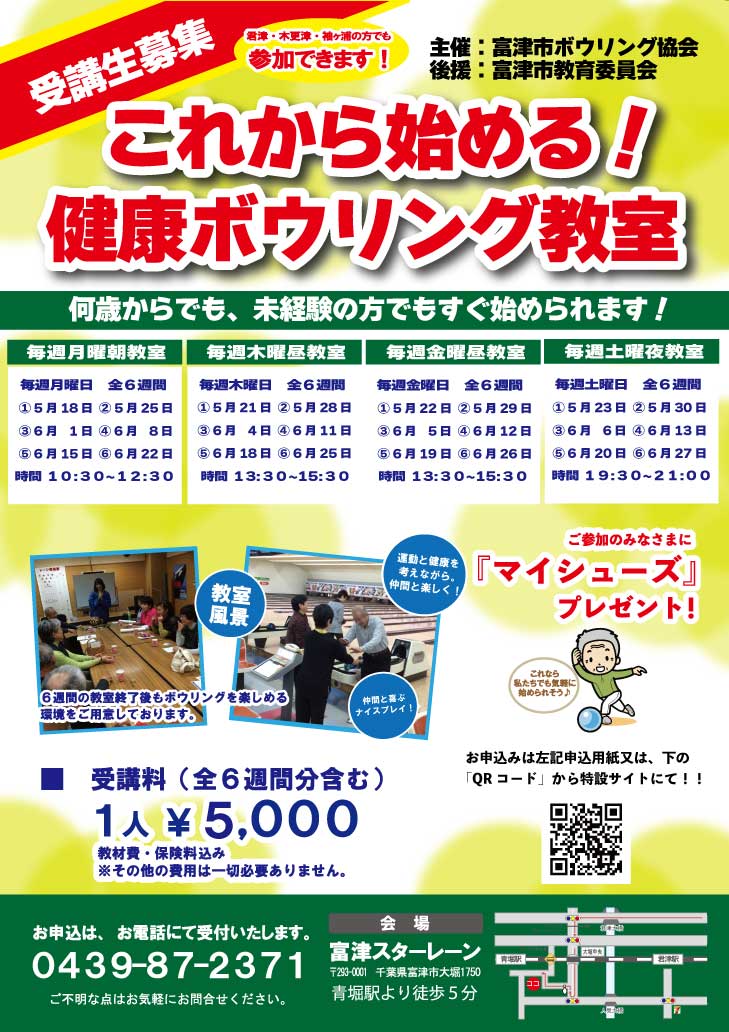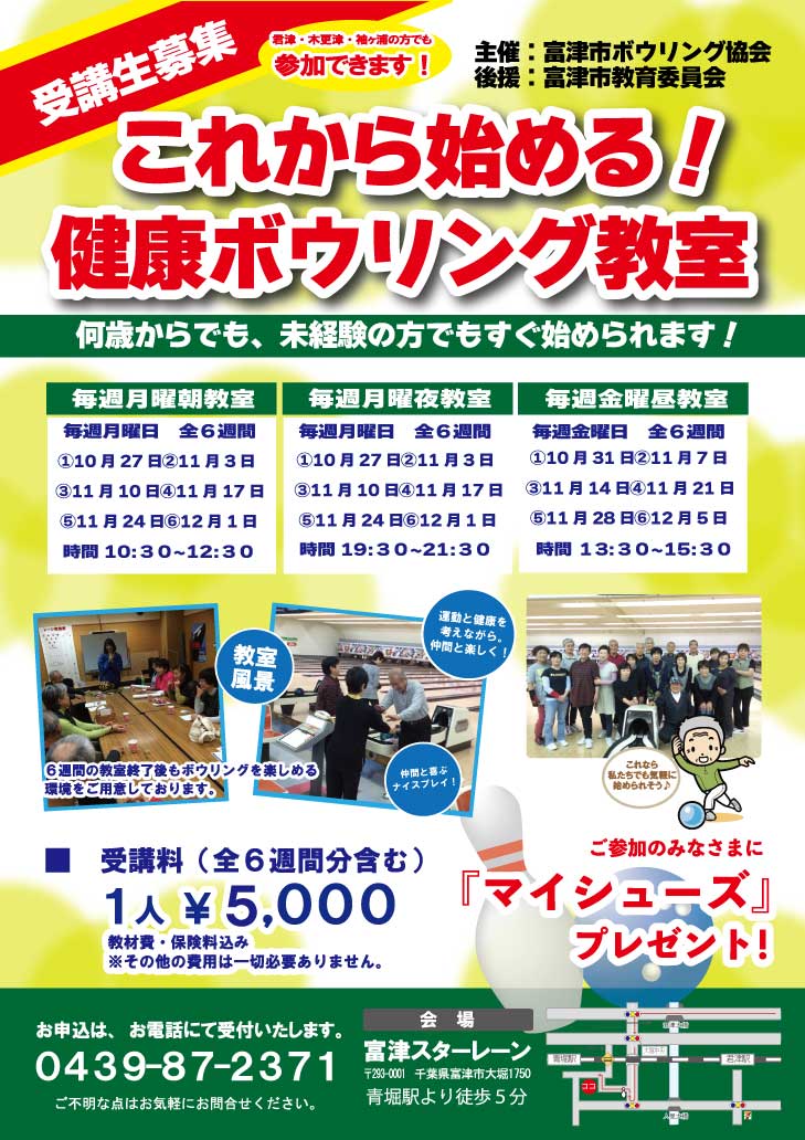 カラダを動かす習慣づくりに!生活習慣病の予防と改善のためにもこの機会に生涯スポーツとしてボウリングを体験してみて下さい老若男女問わず,どなたでも気軽に安心してご参加いただける内容です。申込みフォームへ進む申込みフォームへ進む主催/富津市ボウリング協会会場/富津スターレーンTEL 0439-87-2371