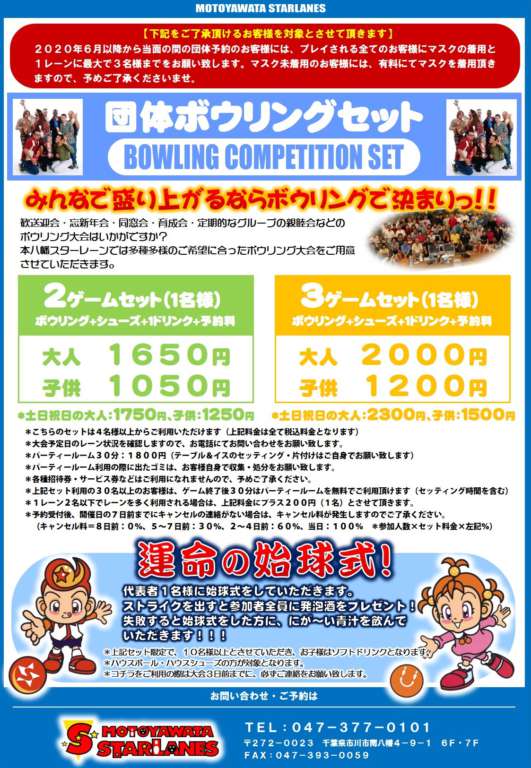 参加人数によりましてはいくつかのご提案もできますので、まずはご希望の開催日時・参加人数・レーン数・ゲーム数を、電話またはメールでお伝えください。
