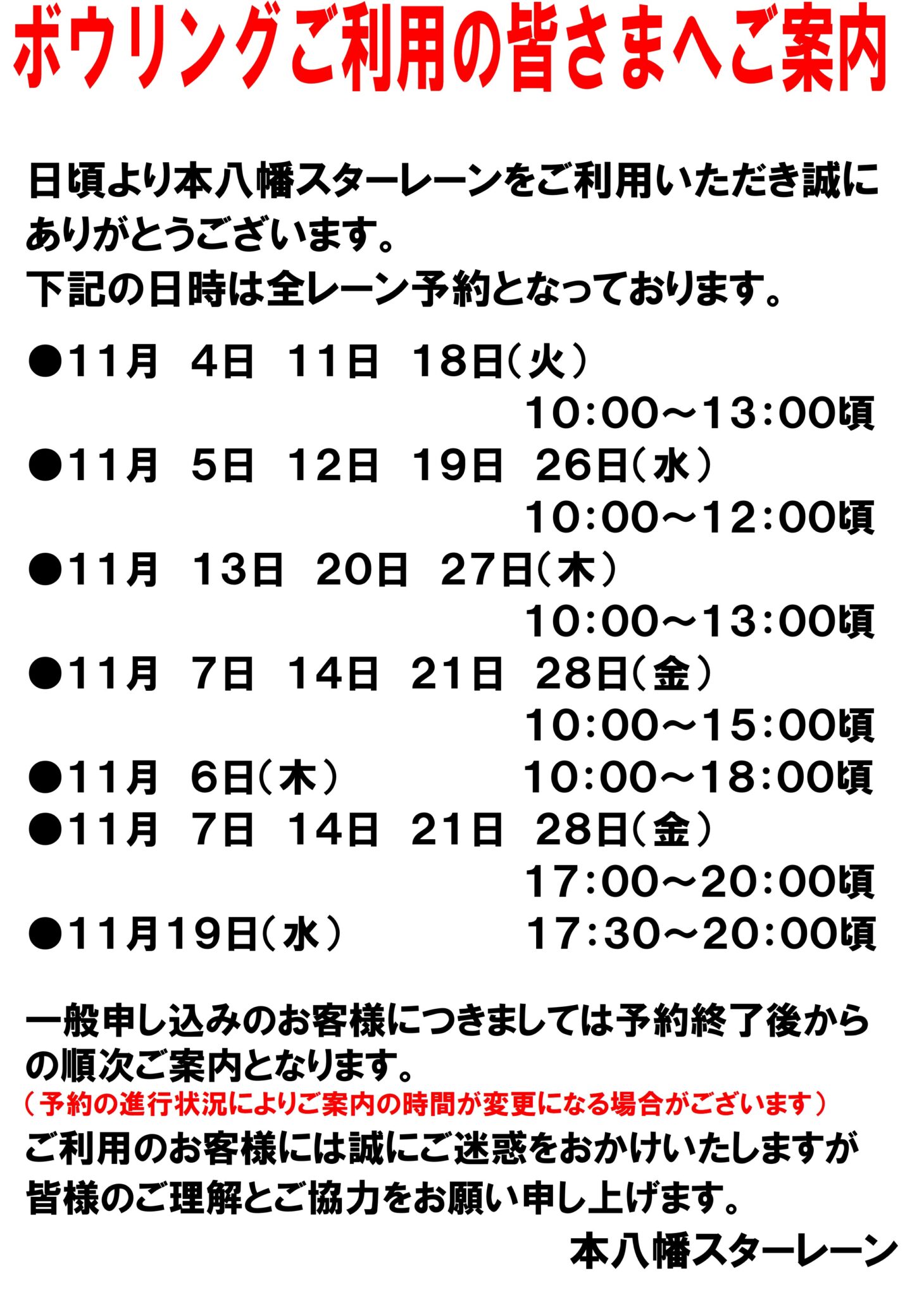 【全レーン予約のお知らせ】