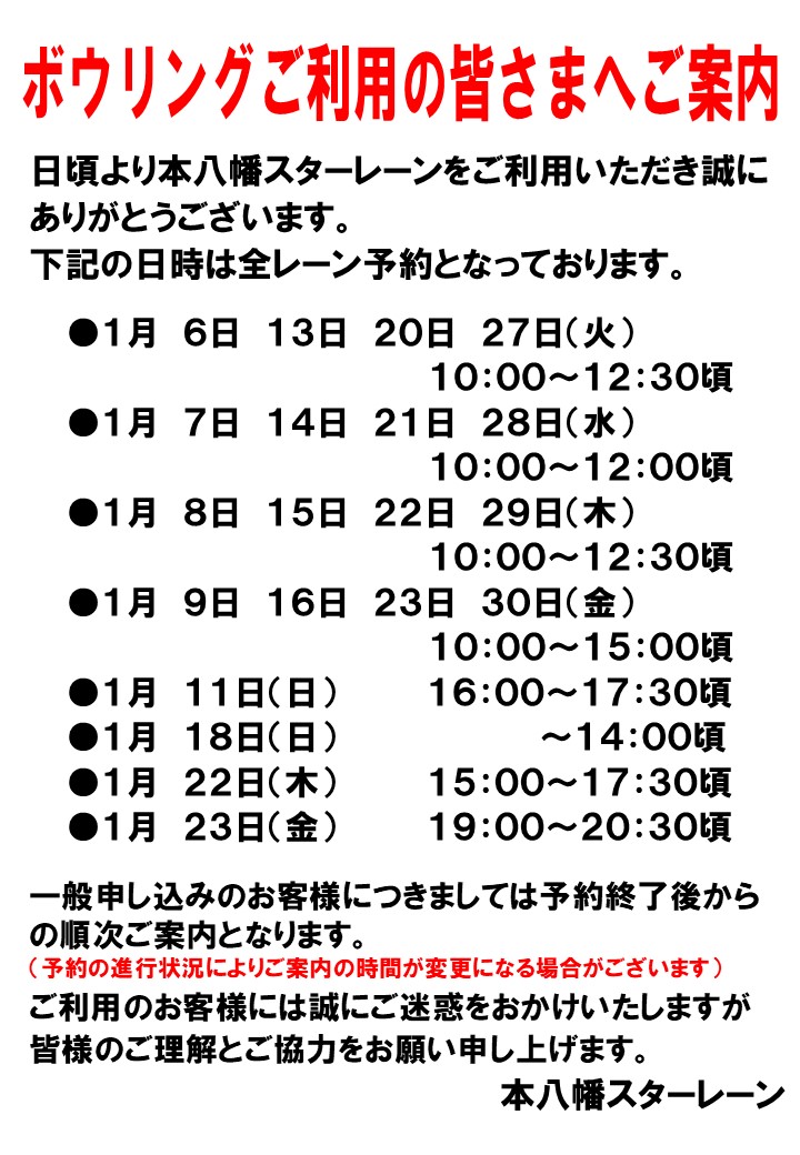 【全レーンご予約のお知らせ】