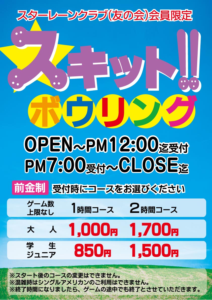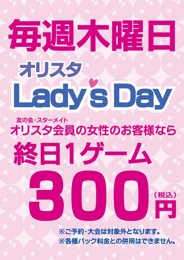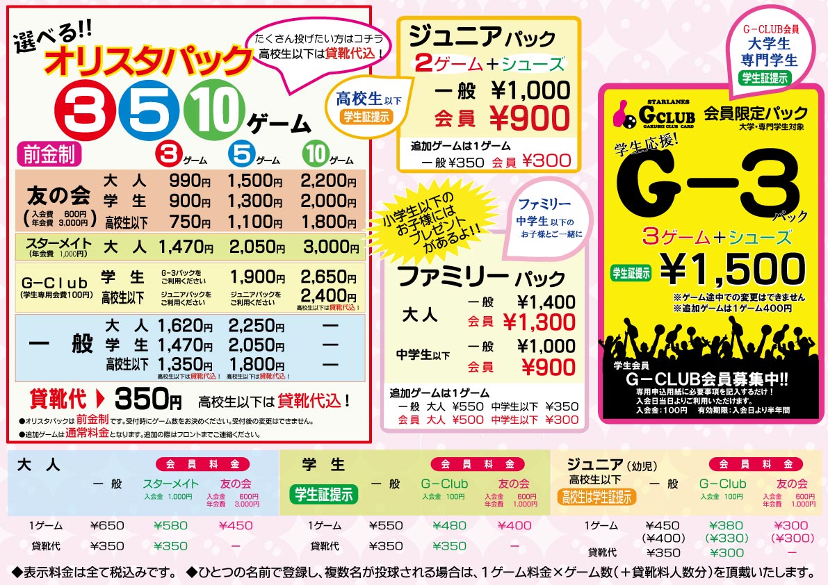 サービスパック※全てのプランがご予約・大会等にはご利用いただけません。※特別営業期間中は、料金の変更・又は休止する場合がございます。※予告なく終了する場合がございます。オリスタパック♥毎週木曜日はオリスタレディースデー♥ ☆スターレーンクラブに入ってたくさん投げよう!☆